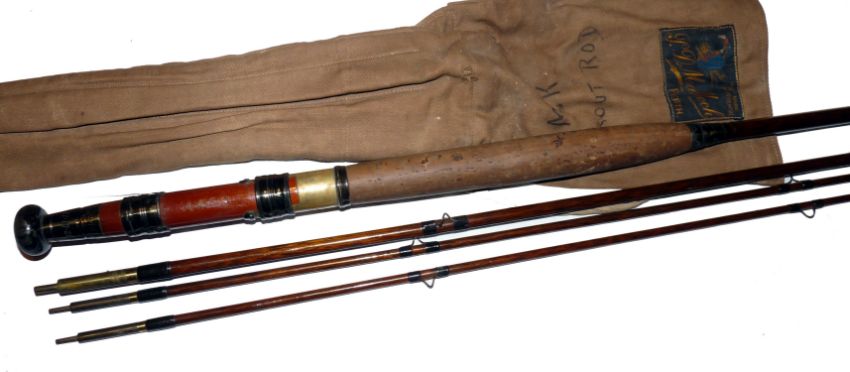 ROD: Early PD Malloch of Perth 9' 3 piece greenheart trout fly rod, c/w spare tip 1" short, red agate butt/tip guides, black whipped snake intermediates, bronze ferrules, wood stoppers, 7.5" sheet cork handle with bronze brass reel fittings, mahogany reel seat and button, fine early ladies rod, in MOB with Malloch label.