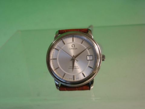 An Omega Gentleman's Wristwatch Officially certified automatic chronometer movement no. 49638416. Stainless steel case, the silvered dial with baton numerals and date complication. Maker's leather strap. Boxed with leather wallet. To include certification and manual. 34mm diam