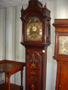 A George III Eight Day Longcase Clock The mahogany case with pagoda hood, painted in colours with vase, musical instruments, drapery and flower garlands, the break arch dial with moonphase and signed Dan. Dickerson, Framlingham. 94" high.