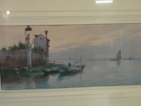 Eugenio Benvenuti 1881-1959 Italian harbour scene with boats and figures. Signed. Watercolour on paper 6 ½"x 14 ½"