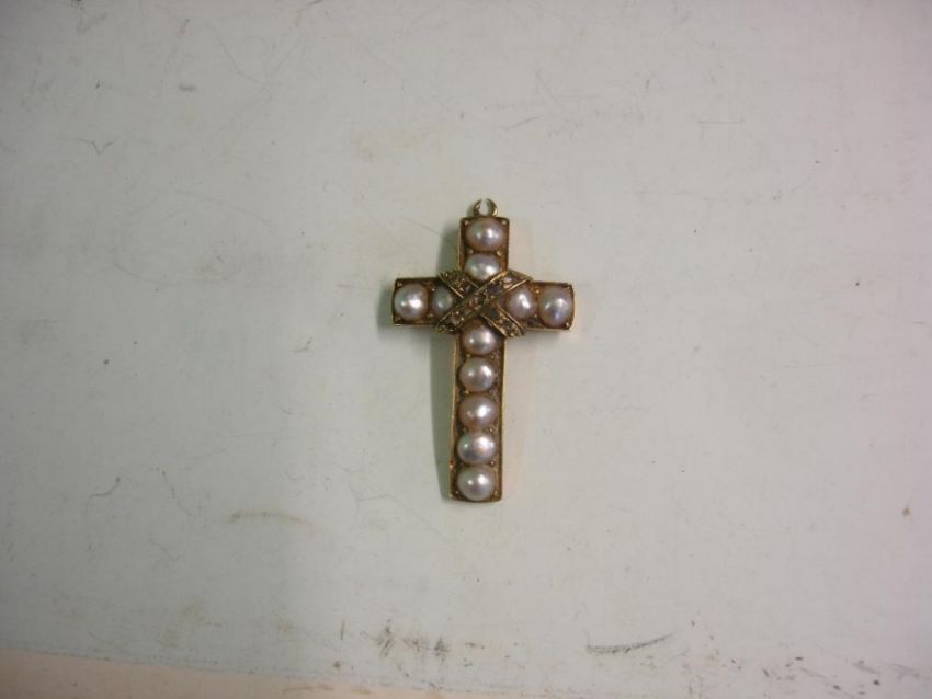A Gold Crucifix Set with seed pearls and old cut diamonds. 30mm high. Probably 18th century