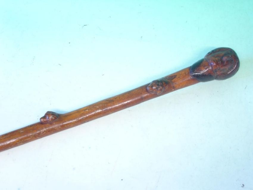 A Fruitwood Walking Cane The grip carved as head of George Washington, the shaft with five hound's heads. 18th century. 34" long.