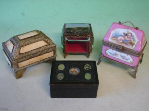 Four Decorative Boxes Viz: A Limoges casket on stand (AF), an Indian ebony box (Damage to inner rim), an Indian bone and brass box and a four glass pictoral casket