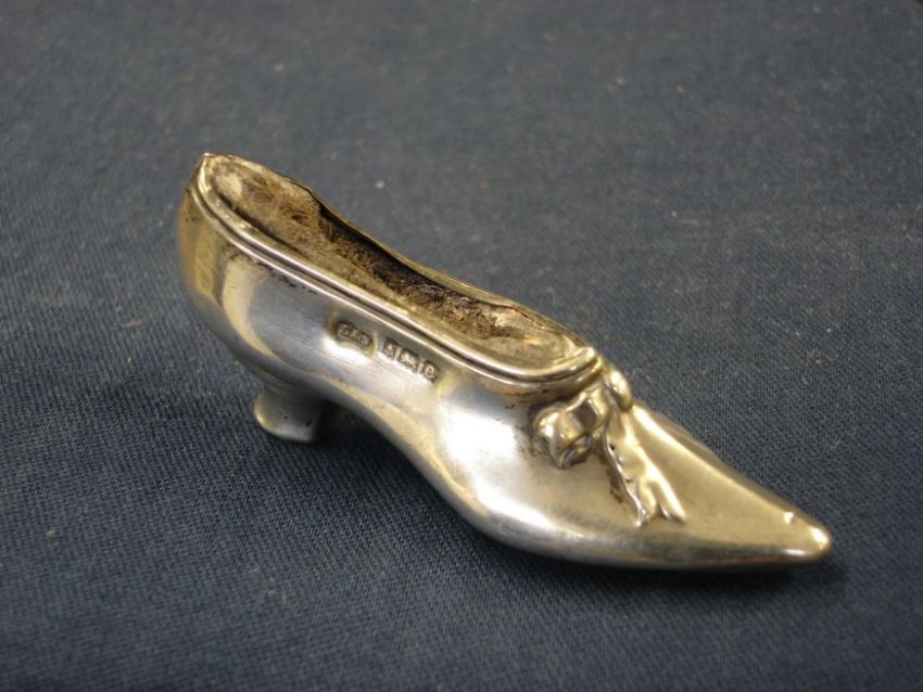 A Silver pin Cushion In the form of a lady's shoe. Birmingham 1904-05. 2 ¾" long