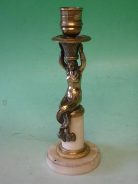 A Bronze Candlestick Neo-Classical in form, the stem a mermaid holding on her head a wicker basket, she seated on a marble socle. Circa 1820. 9" high. (Nozzle drilled and base damaged)