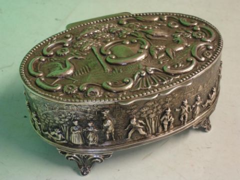 A Victorian Silver Trinket Box of oval form, the hinged lid boldly embossed with birds, trees and C scrolls around a vacant cartouche, the body decorated all round with rustic figures at play, a village beyond, raised on scroll feet. Birmingham 1897-98. 5 ¾" wide. Maker: Probably T. Hayes. 8ozs 6dwts
