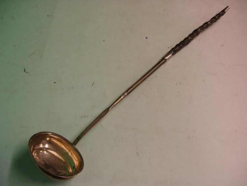 A George 111 Silver Punch Ladle with bright cut decoration and twisted whalebone handle. 15 ½" long. Maker: Thomas Morley
