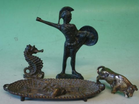 Four Small Items of Bronze Viz. A dish, bison, seahorse and a gladiator