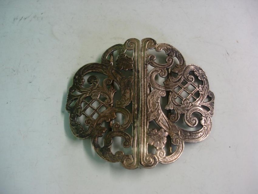 A Silver Belt Buckle In two halves. Pierced and scrolled decoration.