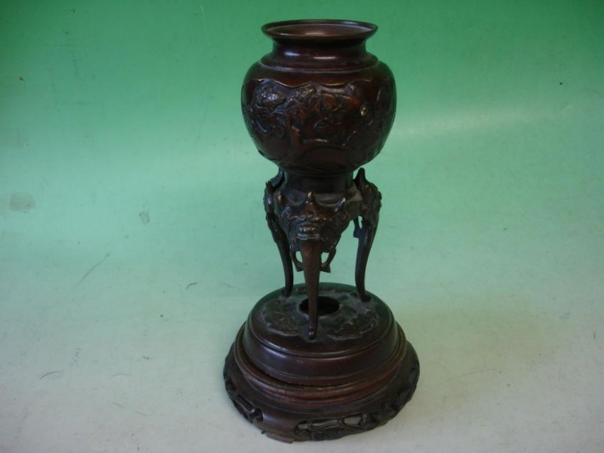 A Japanese Bronze Vase. Meiji. Relief decoration of birds and prunus, raised in mythical beast supports and associated hardwood stand. The bronze 8" high