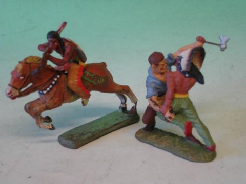 Hausser Elastolin A 120mm Indian figure riding a horse with rifle and an Indian and cowboy wrestling.