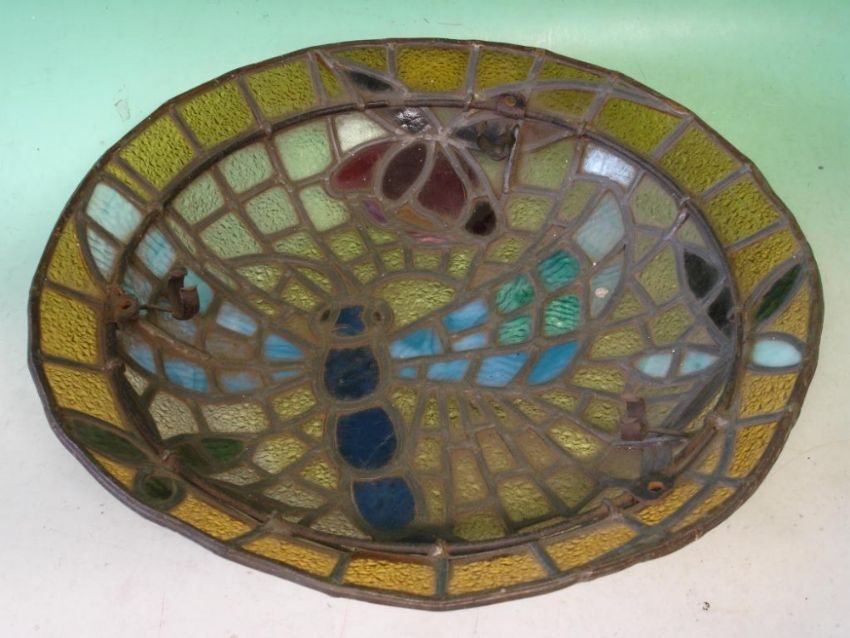 A Stained glass Plafonnier In the style of Tiffany Studios with dragonfly and foliage in colours. Early 20th century. 17 ½" diam