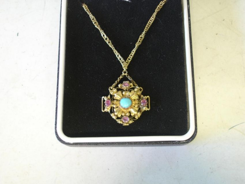 A Gold Openwork Pendant Set with a turquoise and four amethysts. Adapted