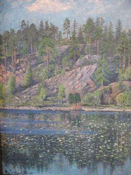 Hjalmar Trafvenfeldt 1851-1937 Lake scene with wooded slope. Signed and dated 1925. oil on canvas 25"x 18"