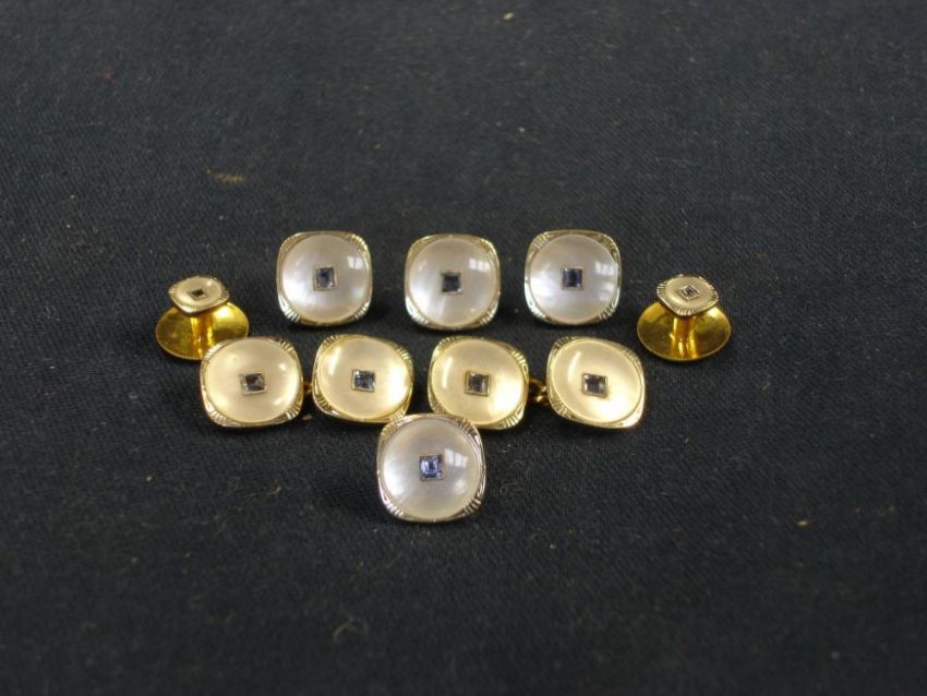 A Set of 9ct Cufflinks and Studs Comprising a pair of cufflinks, two shirt studs and four buttons, each with a sapphire set in mother-of-pearl and 18ct setting