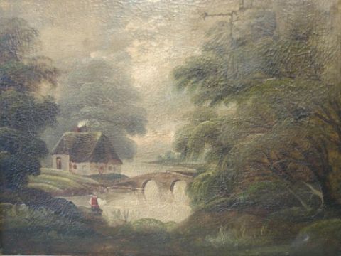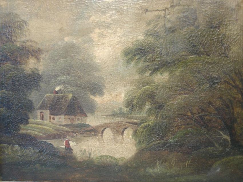 English Naïve School River scene with cottage and angler. Oil on patched canvas 20"x 24"