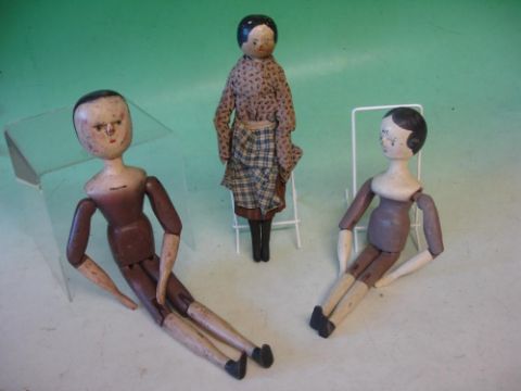 A 10 ½" Grodner Tal Painted Wooden Doll c1860, together with two later peg dolls