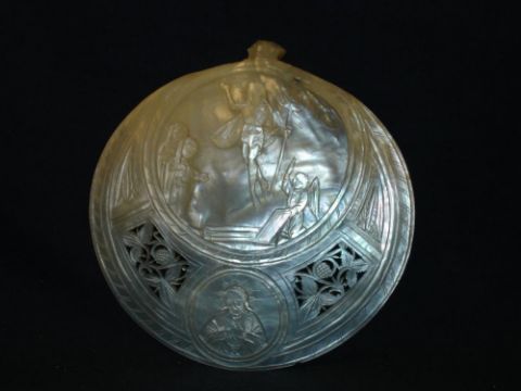 An Abalone Shell Carved in relief with a scene of the Ascension and pierced with foliage. 5" diam.