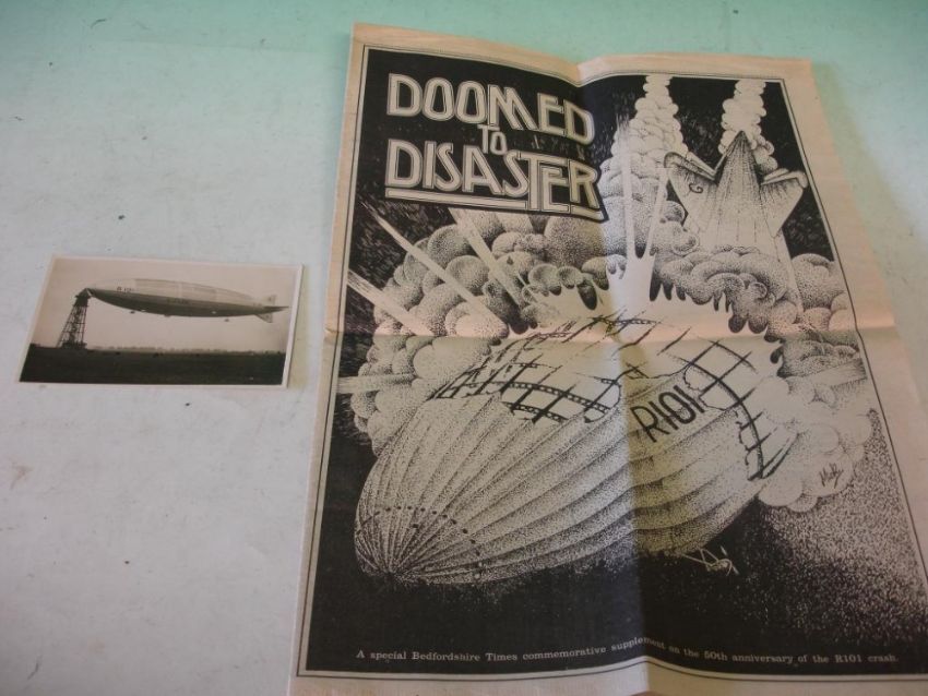 A Postcard Depicting The R101 Airship Together with a Bedfordshire Times commemorative supplement on the 50th anniversary of the R101 disaster