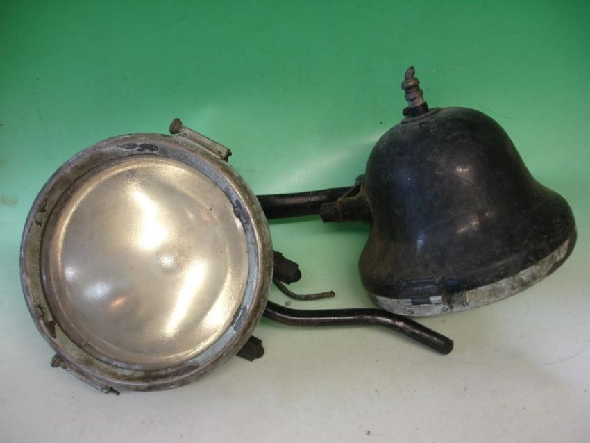 Automobilia: A Pair of Headlamps Black painted bodies and bevelled lenses. With dumb-iron brackets. Possibly French. C. 1920. 11" diam