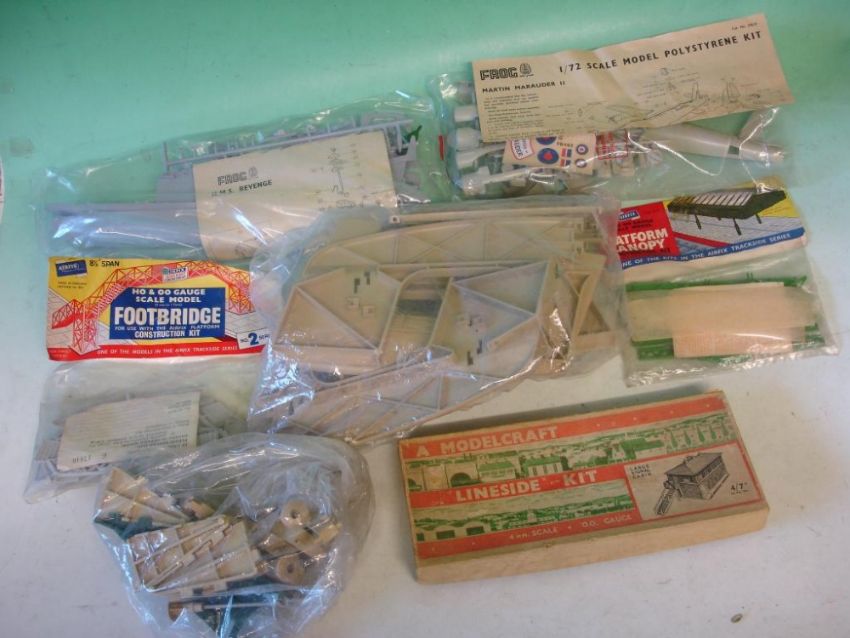 Two Frog Aircraft Kits together with a Modelcraft Lineside Kit signal cabin, Airfix footbridge and platform canopy and Scalextric bridge kit