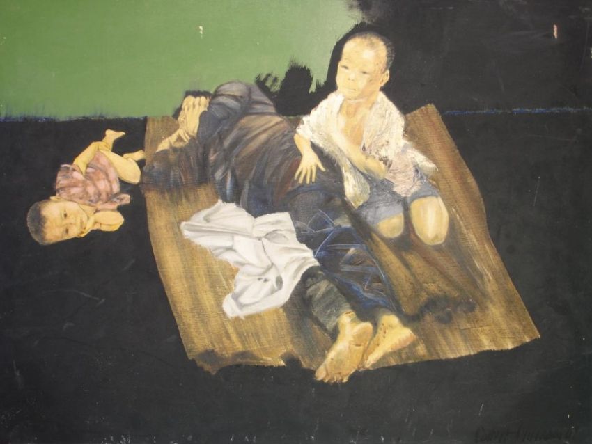 Vietnam War Interior with a mother lying on a rush mat with two young children. Indistinctly signed and dated '67. Oil on hardboard 22"x30"