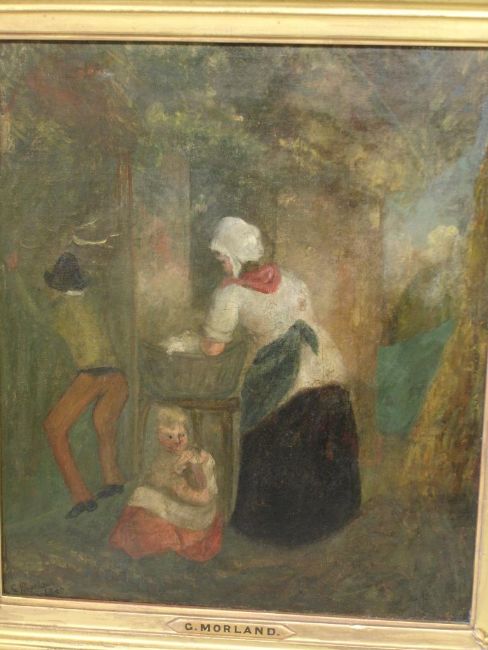 After Morland Washer woman by a cottage door with children. Bears erroneous signature and date 1840. Oil on canvas 14"x 12"