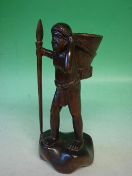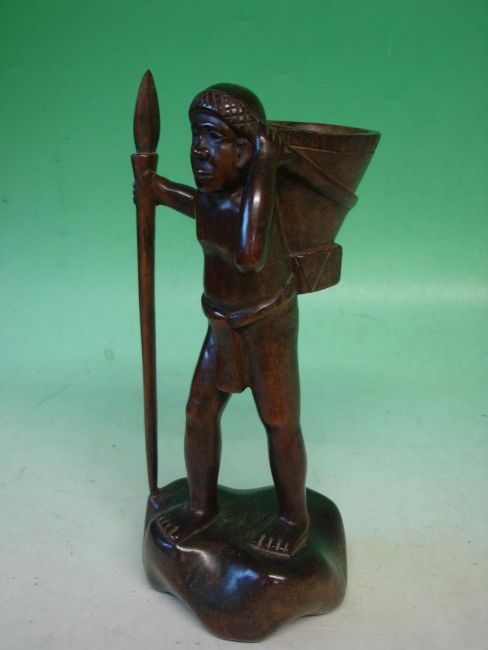 An Ethnic Carved Hardwood Figure A man with a basket and spear. 11" high