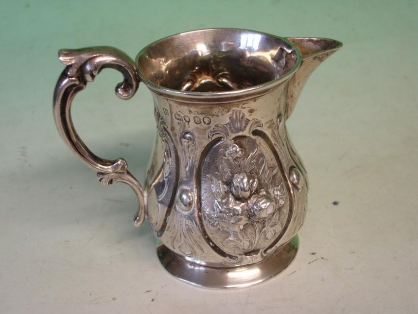 A Victorian Silver Cream Jug Embossed with flower sprays in reserves, double scroll handle. London 1859-60. 4ozs 4dwts