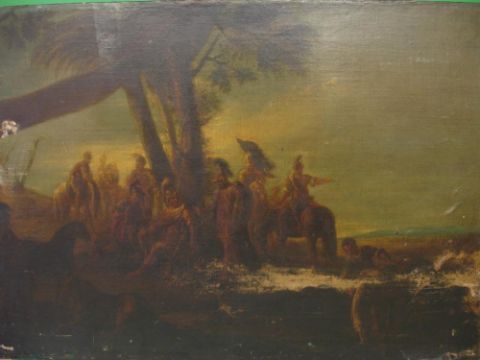 European School Roman soldiers at rest beneath a tree in the evening light. Oil on lined canvas 27 ½"x 41". 18th Century