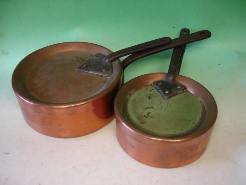 Two copper saucepans With Covers Stamped Temple and Crook. Iron handles. The larger 11 ½" diam.