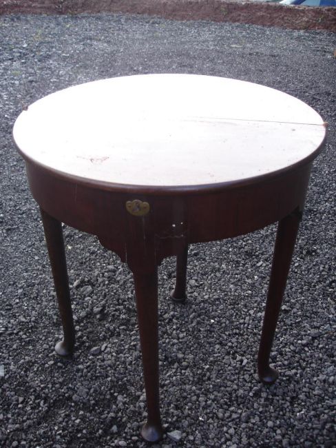 A George I Mahogany Tea Table Of demi-lune form, with fold-over top, the other side hinged to reveal a well, raised on tapered legs with pad feet. 25" wide. Requires renovation