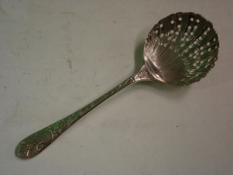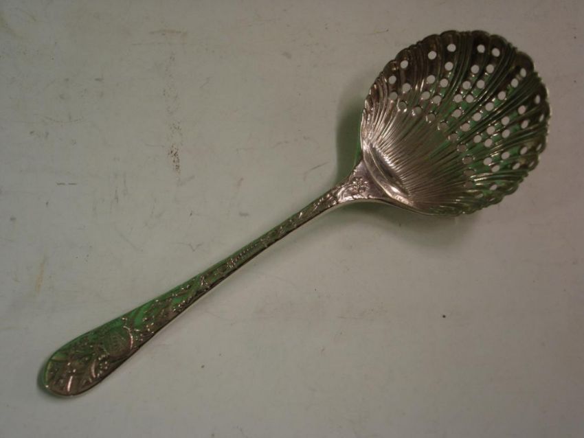A White Metal Sifter Spoon With shell form bowl, the handle relief decorated with birds and foliage. Bears registration mark. 4 ¼" long