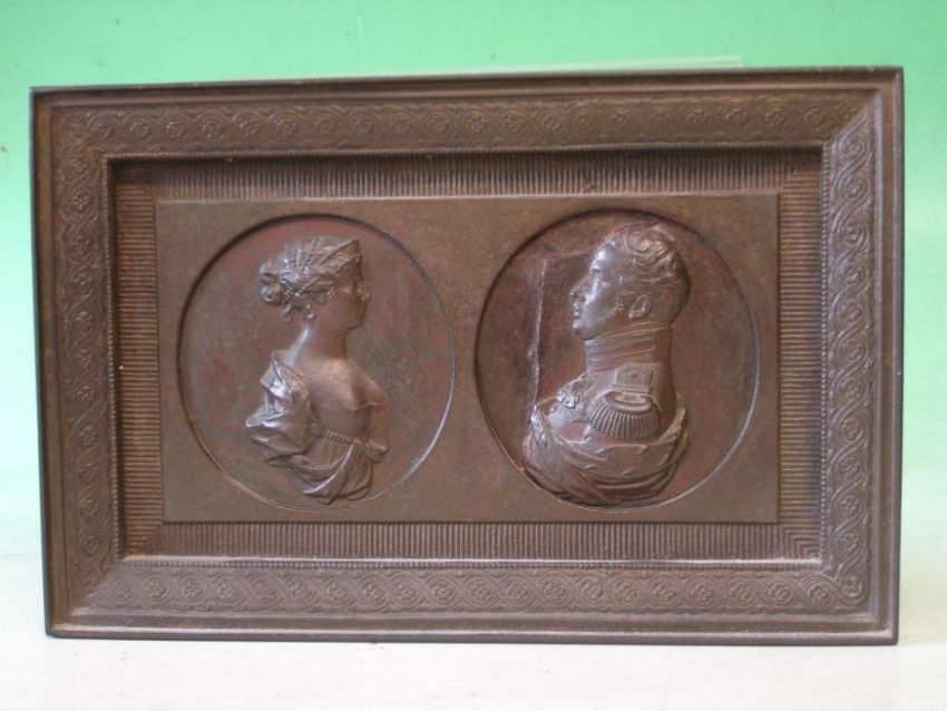 A 19th Century Iron Portrait Plaque Containing a pair of relief profiles of Frederick William 111 of Prussia and his wife Luise of Mecklenburg Strelitz. 9 ½" wide (Damage and repairs)
