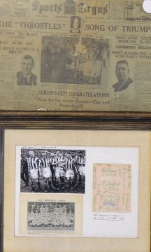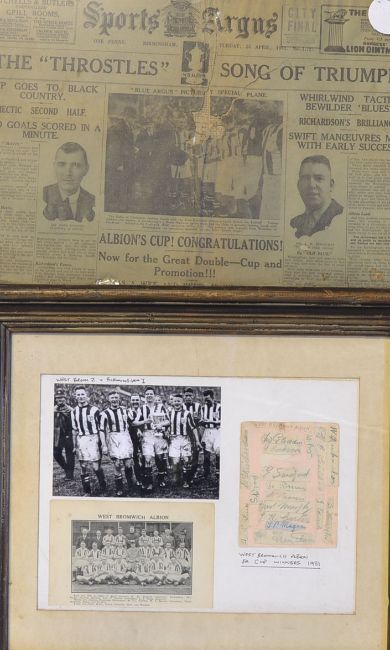 Hardwood Framed 1931 Tribute to West Bromwich Albion FA Cup Winners including hand signed autographs on laid down autograph page. Hardwood Framed Sports Argus newspaper with 1931 FA Cup Final match report, 1954 FA Cup Final football programme with newspaper report and a 1931 newspaper regarding the FA Cup Final. (A Lot) Condition varies.