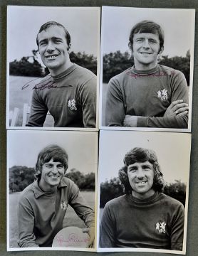 Chelsea black and white autographed player photos of Ron Harris, John Hollins, Paddy Mulligan and John Phillips, each hand signed, size 16 x 21cm in G condition (4)