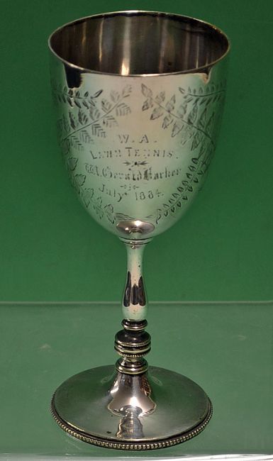 Early 1884 Wirral Archers Lawn Tennis Club silver-plated 1884 engraved chalice trophy - The bowl is engraved with ferns and the words, “W. A. Lawn Tennis - W. Gerald Barker - July 1884.” Major William Gerald Barker of the ‘Wirral Archers’ Lawn Tennis Club, was a very active lawn tennis player during the 1880s. He played mainly at clubs in the north of England, such as Buxton, Moffat - Scotland, Liverpool and Manchester. Probably his best recorded result was in reaching the final of the Liverpool Cricket Club Tournament in 1883 when he was finally defeated by none other than James Bruce Ismay of the White Star Line and Titanic fame. He was born in 1859 and died in 1951 at Torquay, Devon. Overall measuring 14.0cm h