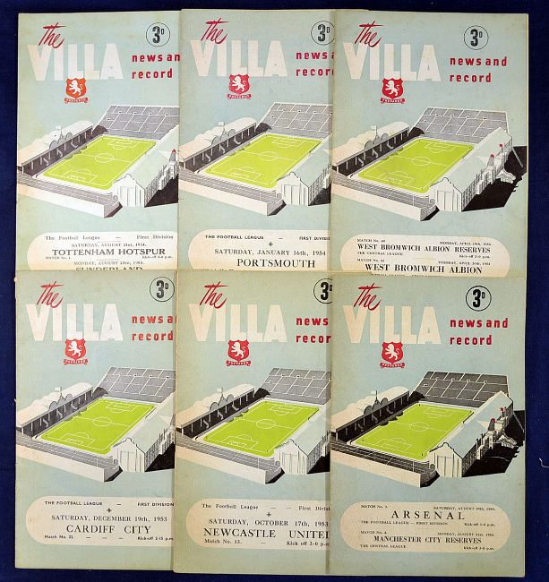 Selection of 1950s Aston Villa (H) Football Programmes to incl 1953/4 v Arsenal, Manchester City Reserves, Newcastle United, Cardiff City, WBA, WBA Reserves, Portsmouth and 1954/5 Tottenham Hotspur and Sunderland, A/G condition (6)