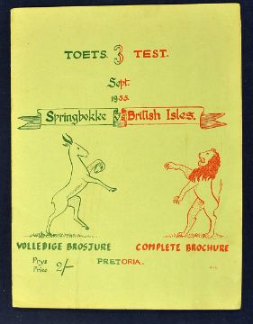 1955 British (Lions) Isles vs South Africa “Springbokke” rugby programme - 3rd test played at Pretoria on September 3rd - unofficial South African programme with some slight pocket folds, hand written scores to the itinerary for the final 5 matches otherwise internally clean hence overall (F/G)