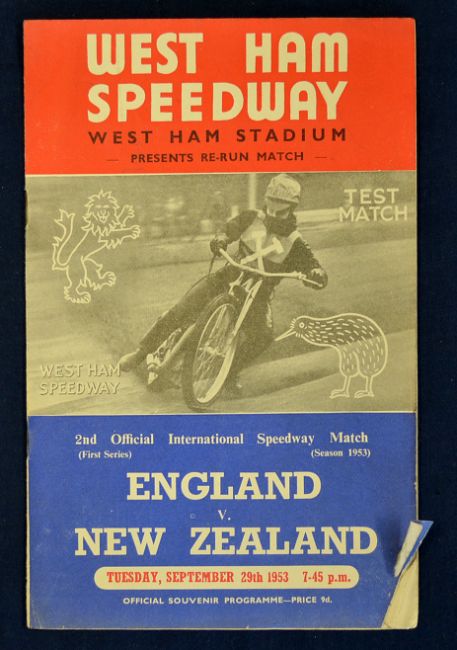 1953 England v New Zealand Speedway programme - 2nd official International Speedway Match-Re-Run, 1st series held at West Ham Stadium on Tuesday, September 29 - hand written results in pencil, some dust stains to the inside rear back pages, minor nicks and tears to one corner otherwise overall (F/G)