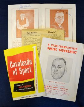 Signed 1954 Joe Davis and Fred Davis snooker exhibition programme dated 11-12/03/1954 at T.A centre Rotherham, Joes Davis (20 years Undefeated Snooker Champion of the World) and Fred Davis (1954 Present Snooker Champion of the World) signed by both players VG example, t/w 1955 Cavalcade of Sport programme with a variety of sports within including Rugby, Athletics, Polo, Hunting, Speedway, Soccer and Greyhound Racing with pencil internally otherwise clean, and 1957 Boxing Tournament programme at Doncaster 28/05/57 clean example some fold marks (4)