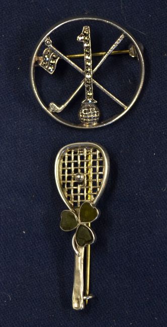 Tennis & Golf brooches to incl white metal tennis brooch racket, 4.5cm, decorated with the three-leafed clover and a silver and marquisette hole-in-one ladies golfing brooch, 3cm diam.