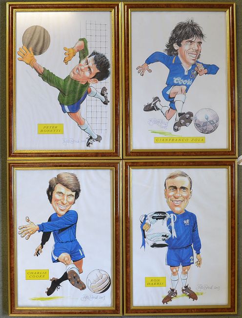 4x Fun Chelsea footballing legends caricature prints signed by the artist Bob Bond featuring Peter Bonetti, Charlie Cooke, Ron Harris and Gianfranco Zola all in G condition mf&g 25 x 32cm