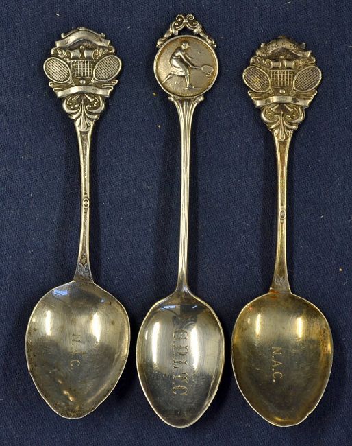 3x tennis silver teaspoons to include 2 with crossed tennis rackets, tennis ball and netting to the finials and engraved bowls “NAC” with one dated 19th -12 – 1949 plus another with a lady tennis player in relief to the finial and engraved bowl GPLTC-all silver hallmarked wt 2oz