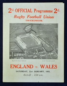 1933 Wilf Wooller Debut for Wales. 1933 England v Wales rugby programme - played on Saturday 21st January with Wales winning the opening game of the season 7-3 and their 1st victory at Twickenham since 1910 - some slight discolouration/thumb stains to the edges otherwise overall (G)
