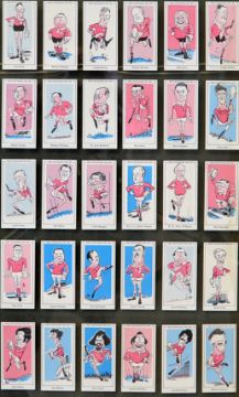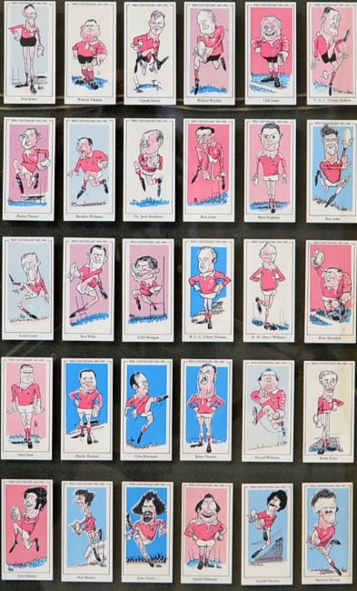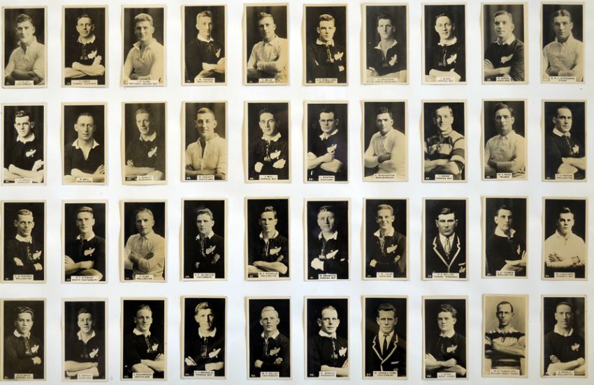 1927 New Zealand Footballers rugby cigarette cards full set mounted and glazed, 50 x 40cm, 1929 Wills Rugby International cards (reprints) loose and W.R.U Centenary 1881-1981 50 famous Welsh players framed and glazed 33 x 70cm (reprints) and England Internationals 1980-1991 (reprints) complete set mf&g70 x 60cm all complete sets t/w a cigarette card canvas with 3x printed cigarette cards to the front (4)