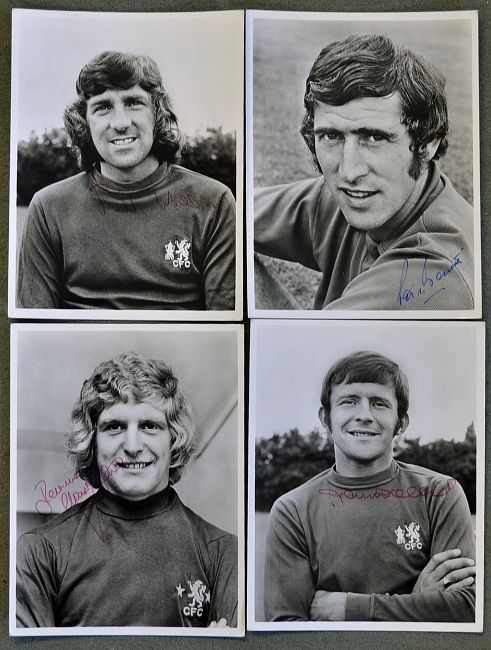 Chelsea black and white autographed player photos featuring Peter Bonetti, John Hollins, Chris Garland and Paddy Mulligan each hand signed, size 16 x 21cm in g condition (4)