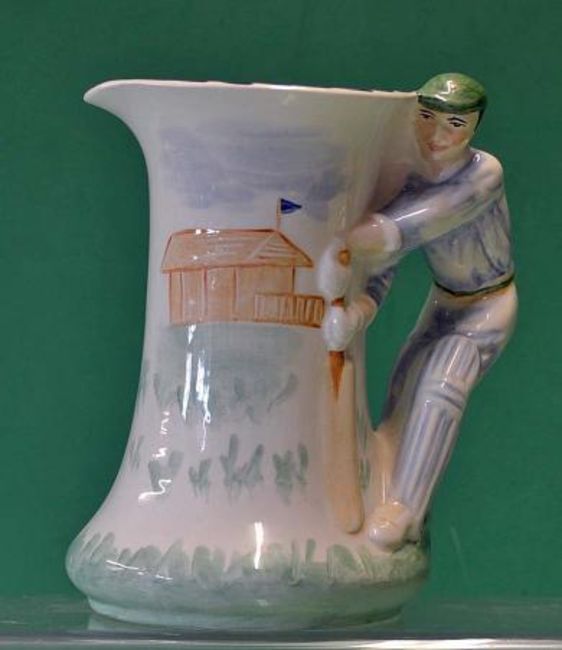 Modern Burleighware cricketers water jug – the handle modelled in the form of a cricket batsman, white and green background – stamped to the base with Burleigh Ware and BD&L marks and inscribed with initials JW- overall 6”h G