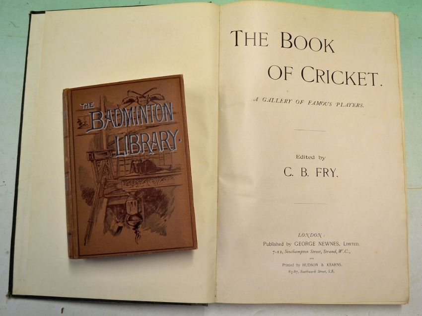 1899 Cricket book - ‘The Book of Cricket’ rebound in green cloth boards, edited by C.B Fry, containing illustrations and information of famous players photographed by Hawkins and Co, internally clean t/w 1890 ‘The Badminton Library’ Cricket, by A.G Steel and R. H Lyttelton with some wear to cover otherwise (G) (2)