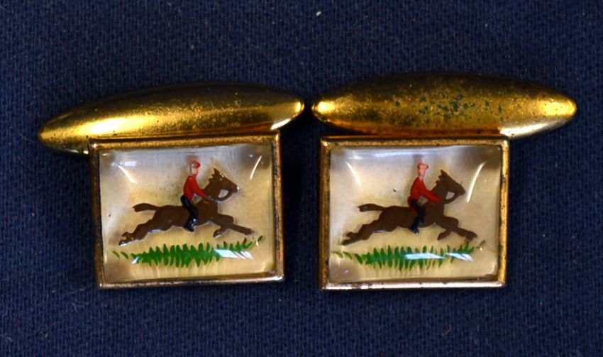 Hunting – vintage pair of gilt rectangular cufflinks featuring a horse and red jacket rider under glass. (2)